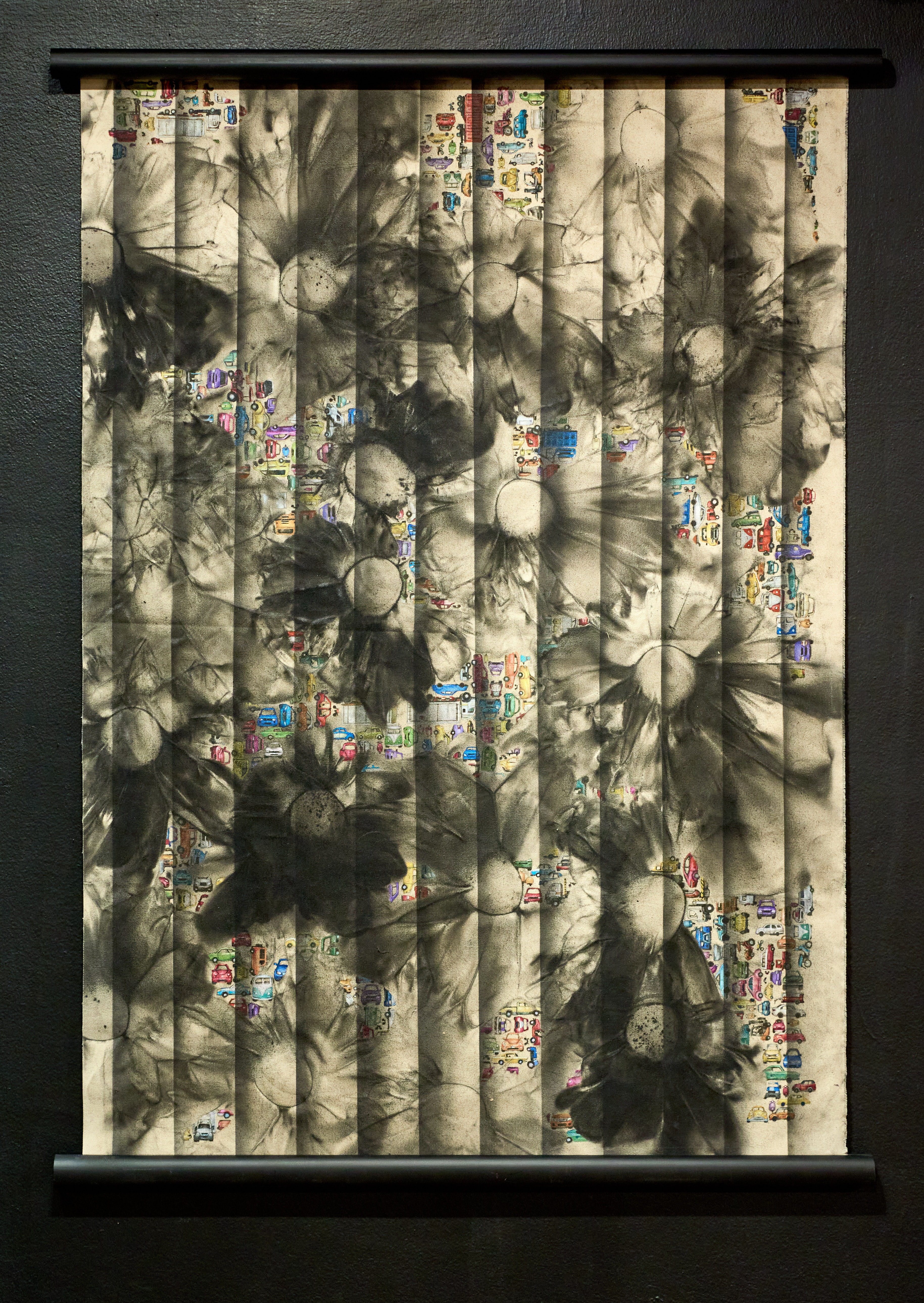 Through a process of capturing carbon fumes from exhaust pipes, from the Poison Flowers series until Poison Flowers Redux, the works reflected an understanding of the pain felt by people who inhale small carbon particles greater than 2.5 microns.