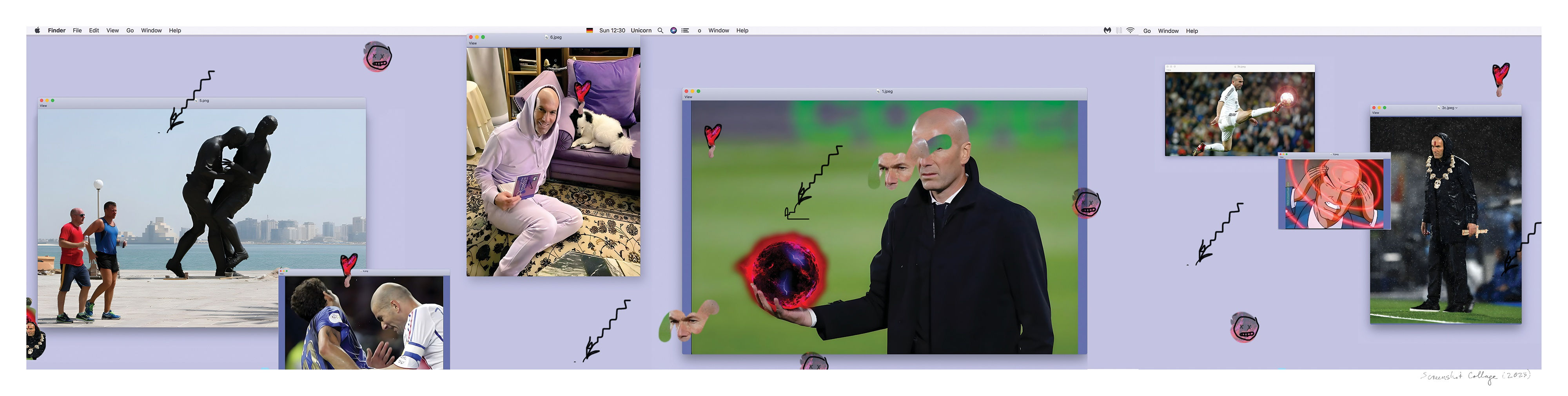 Zinedine Zidane, best known for headbutting an opponent, has spurned countless memes himself and is widely known online as the ‘magician’ with ‘black magic powers’ because of his immense and unexplainable skill. ‘Black Magic— Screenshot Collage Series (2023)’ deconstructs these memes (remixing a remixed image) by imagining a new story of Zidane’s life – from his black magic powers and headbutting incident to finally being comfortably shacked up at home.