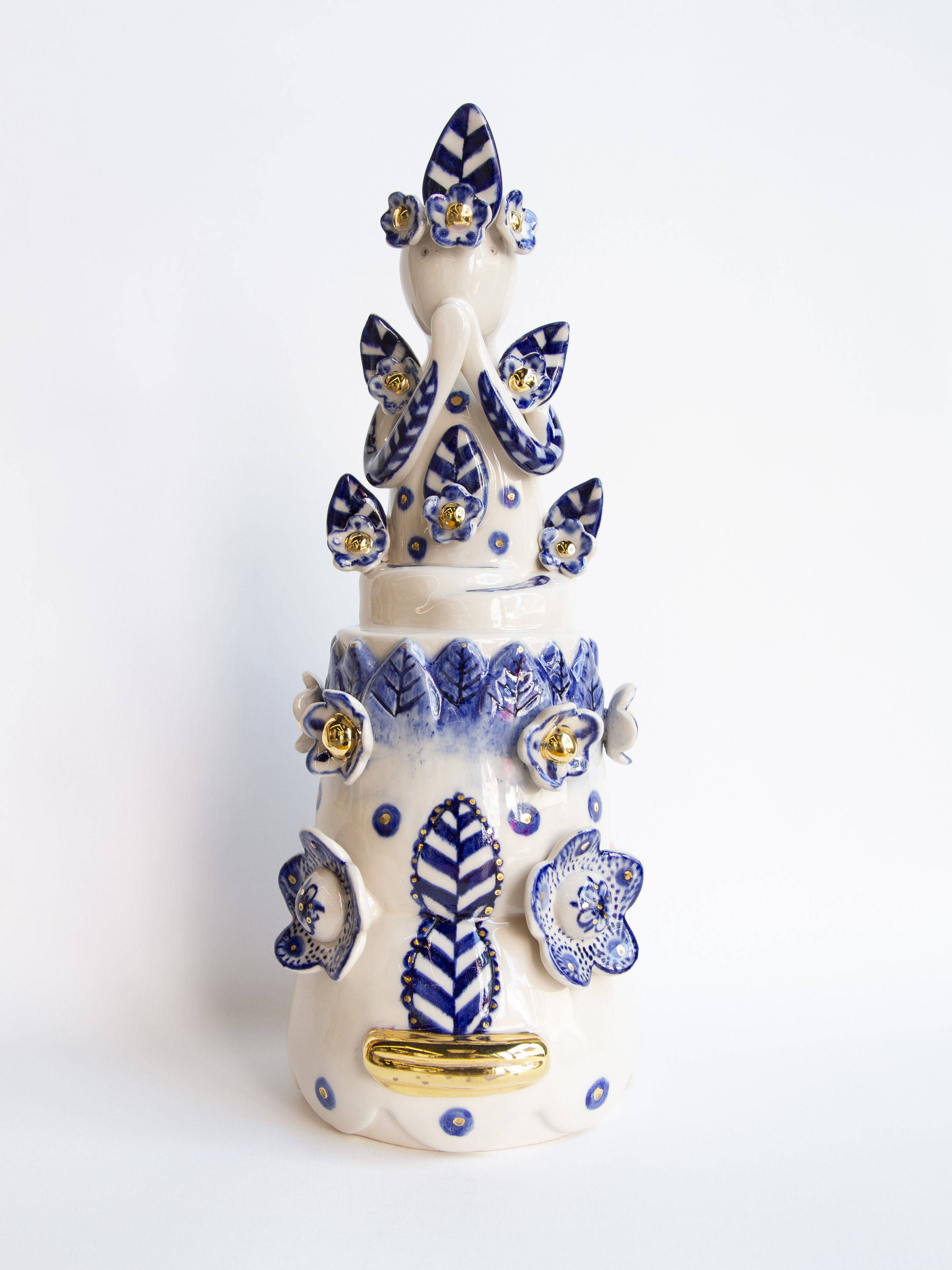 The second piece—a vase that exemplifies a harmonious fusion of historical Chinese artistry with contemporary elements. Inspired by the imperial blue and white style, I've painted a bat, a symbol of good fortune, near Wuhan, an acknowledgment of our interconnected world. The moonflask shape further harks back to classic Chinese porcelain while integrating a modern theme. These two latest pieces aim to reflect on a journey of pushing boundaries, bridging cultures, and celebrate the intricate interplay between life, spirituality, and our shared human experience.
