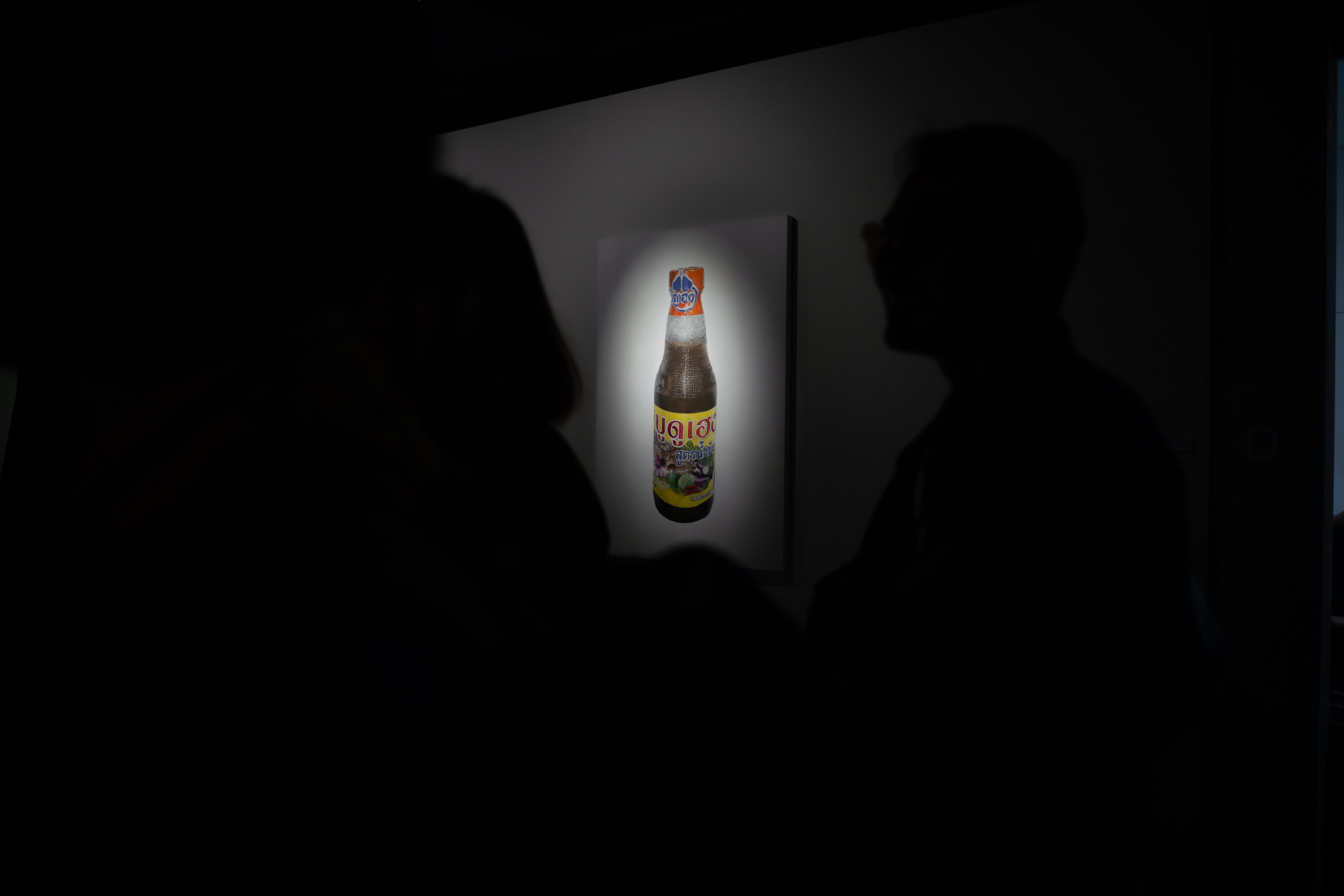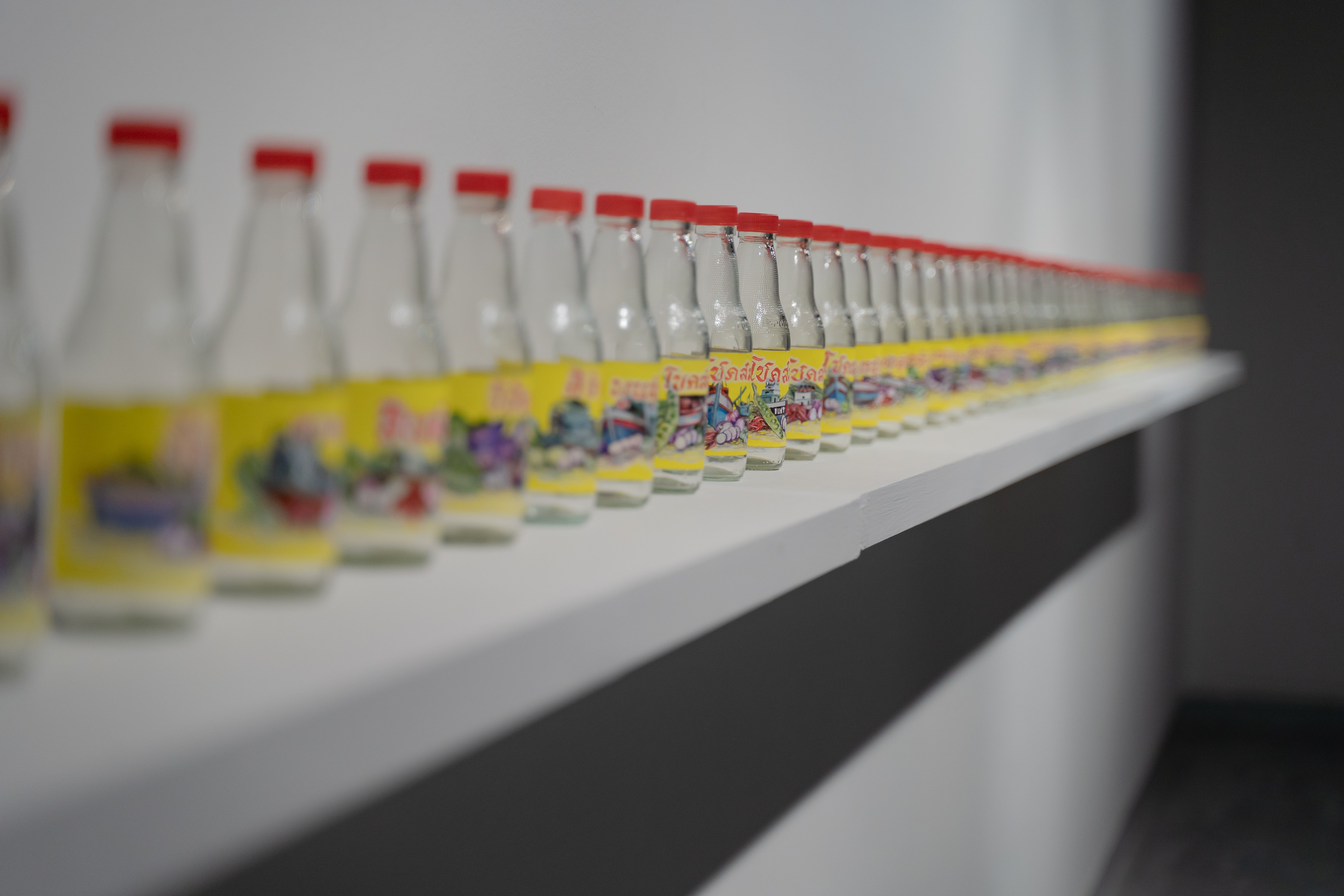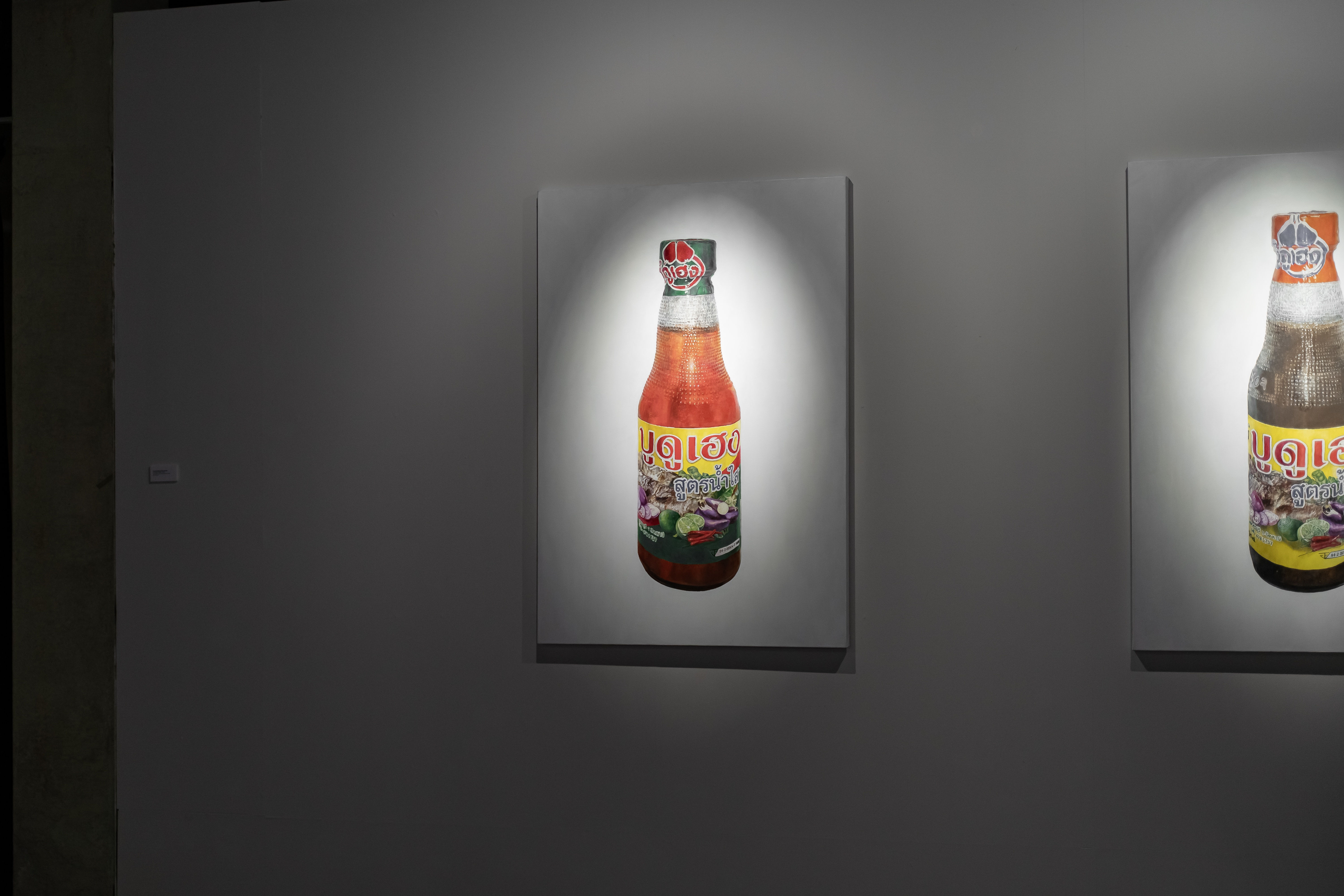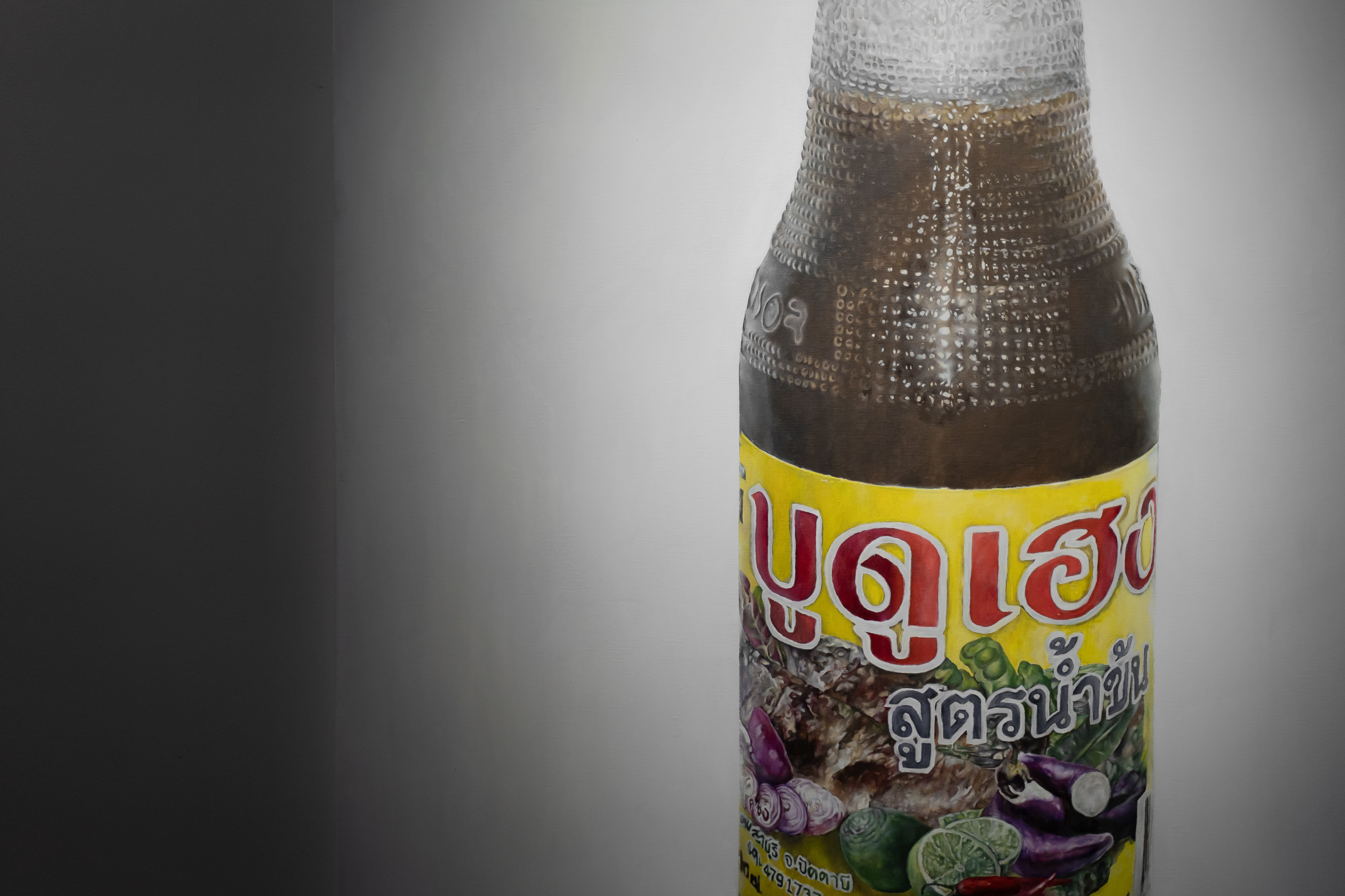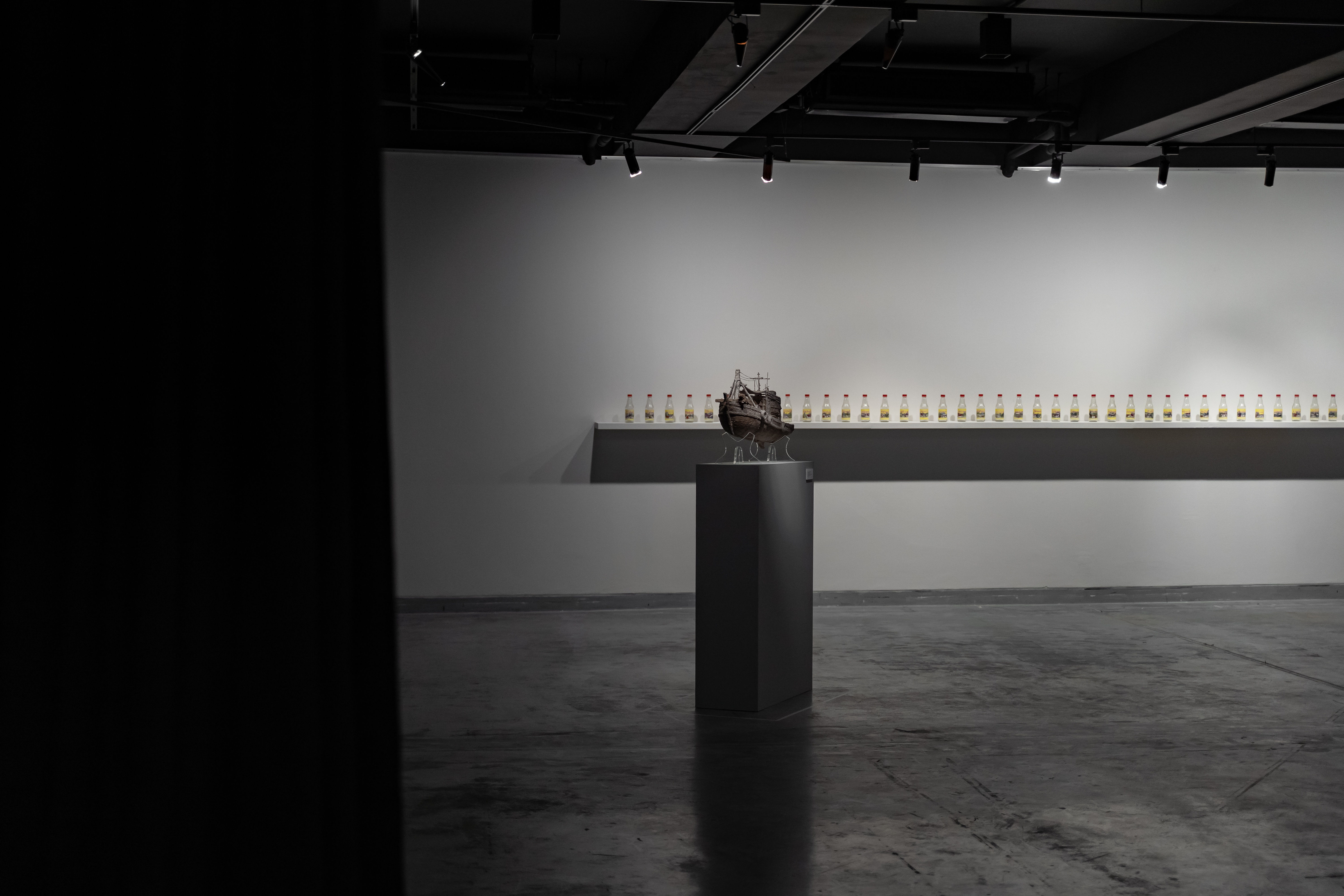 Simultaneously, the exhibition also explores the fate and evolving roles of 48 small boats, which were first dismantled into wood scraps and ultimately repurposed as firewood for boiling fish to make Budu sauce. This transformation is depicted in the installation artwork 48 Lost Boats, which consists of 48 glass bottles filled with Budu sauce, each labelled with a different boat’s name. Alongside this installation are paintings titled Thick Budu Sauce and Thin Budu Sauce, prompting the viewer to reflect on the true value and purpose of a boat.