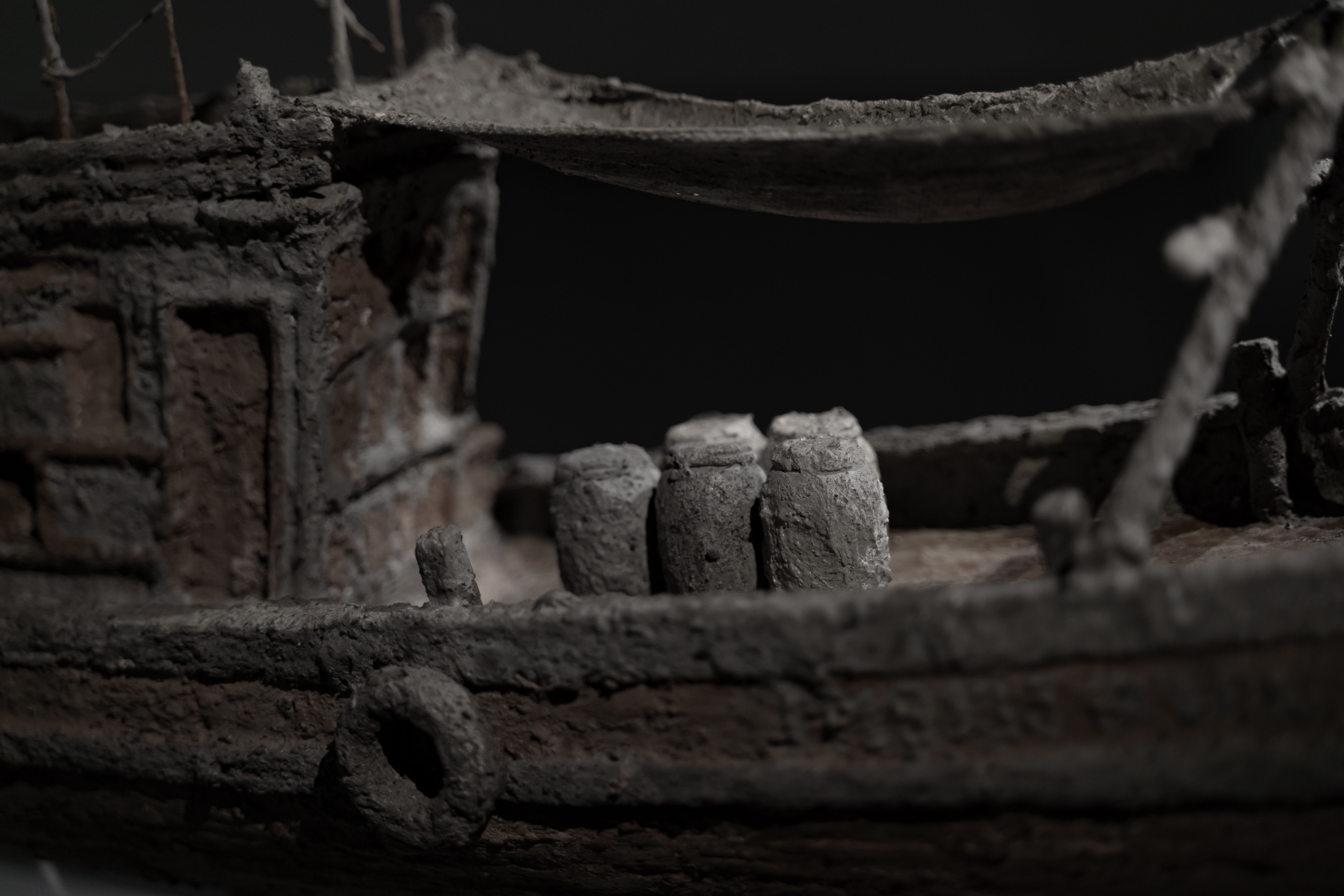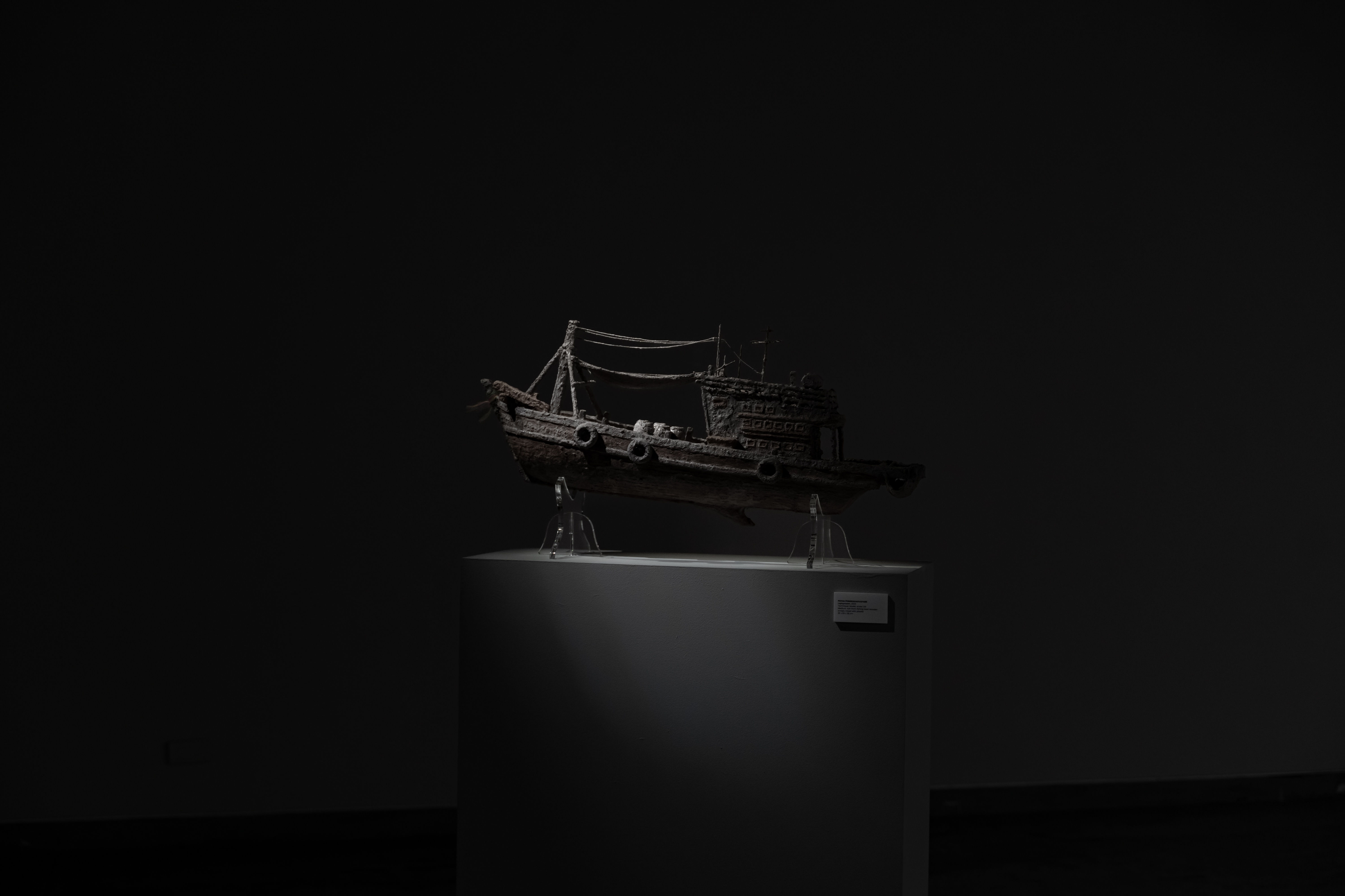 Upon entering the second exhibition room, visitors encounter restored versions of the destroyed boats. The sculptures Anusornnumchok 3 and Laphprasert depict miniature fishing boats. The backstory behind these pieces involves the use of ashes from the burned boat remnants, mixed with ground-up nuts and nails, symbolising the cycle of the boats being reshaped into their original form. The artist also names these pieces after the destroyed vessels, employing various materials to experiment with this transformation.