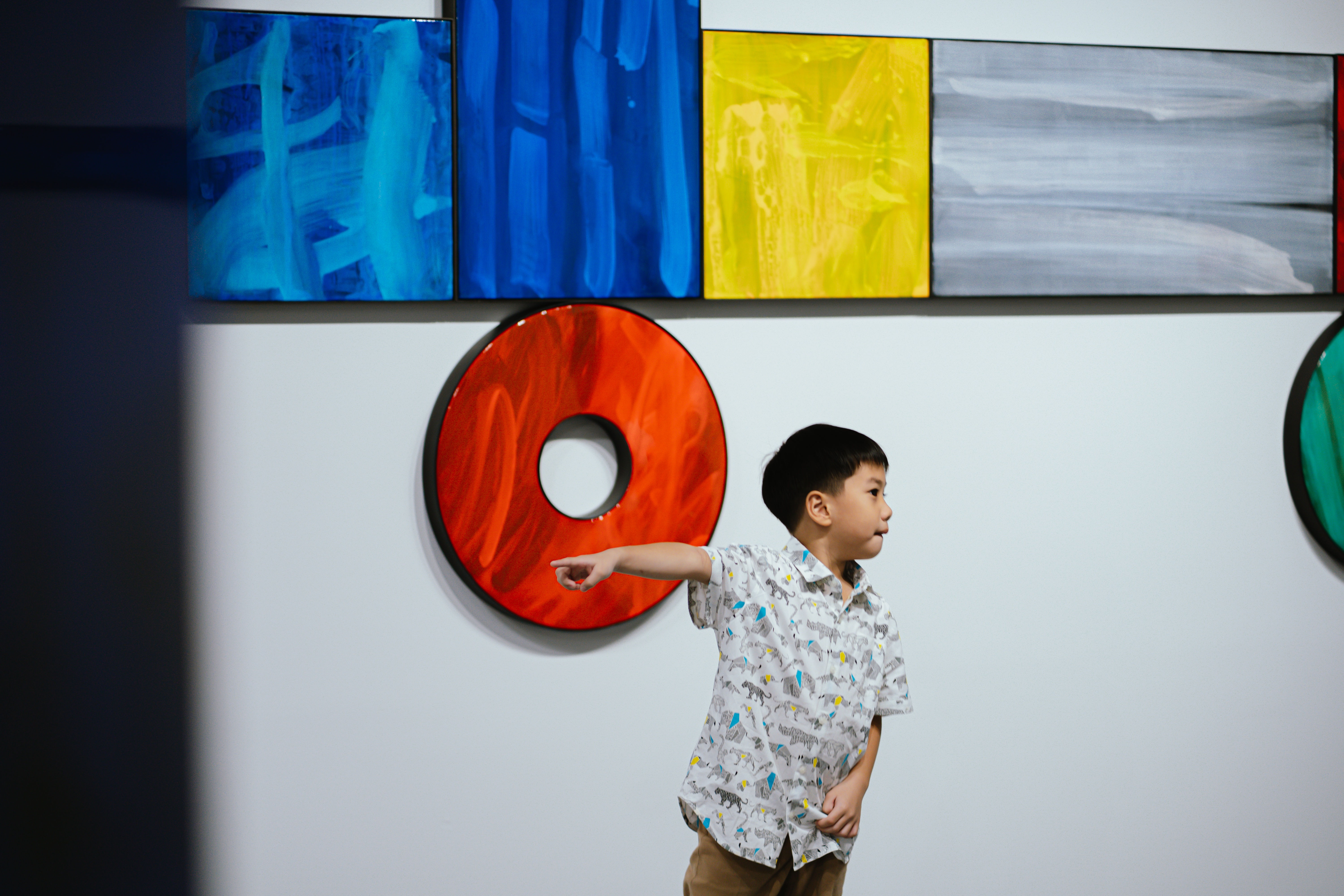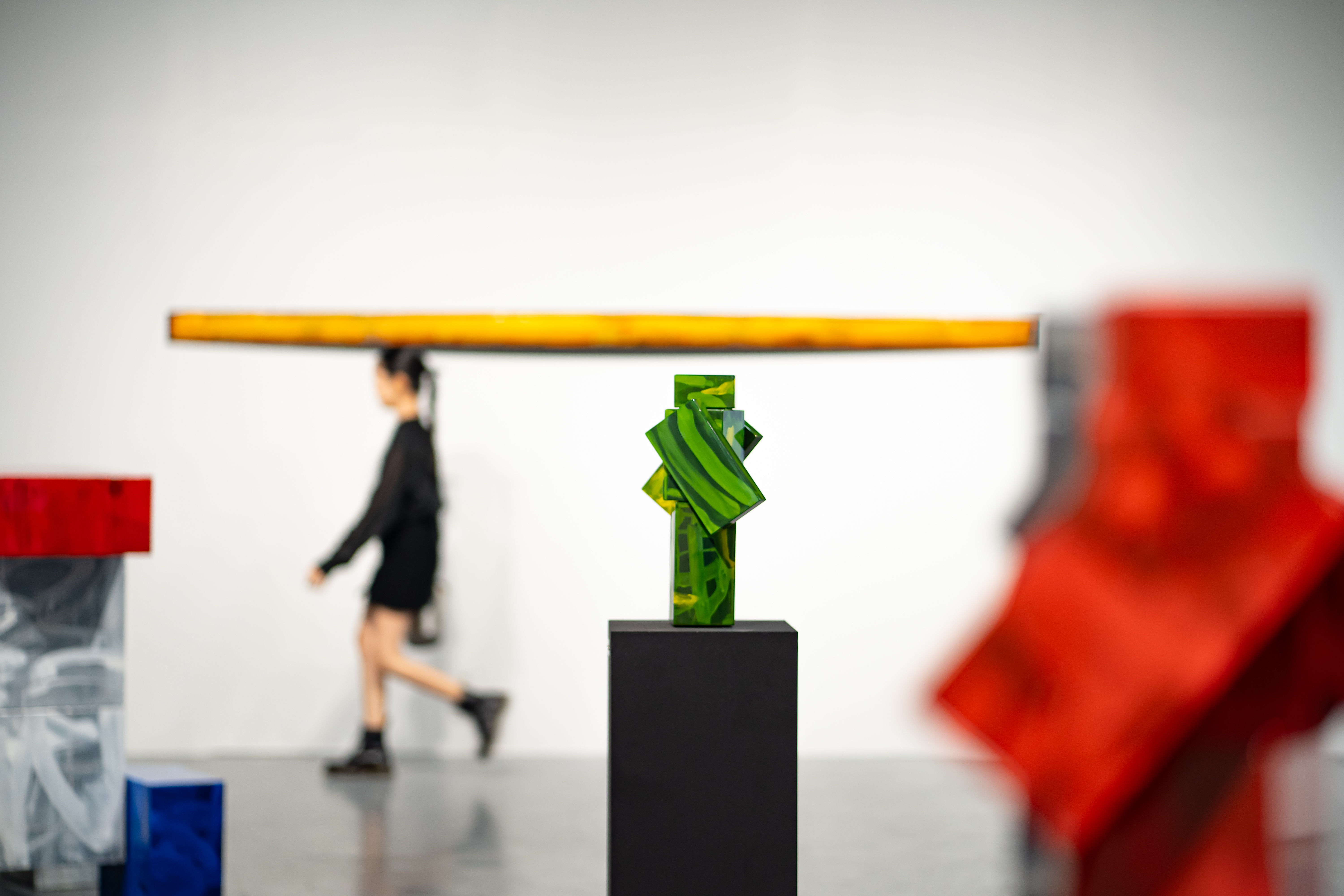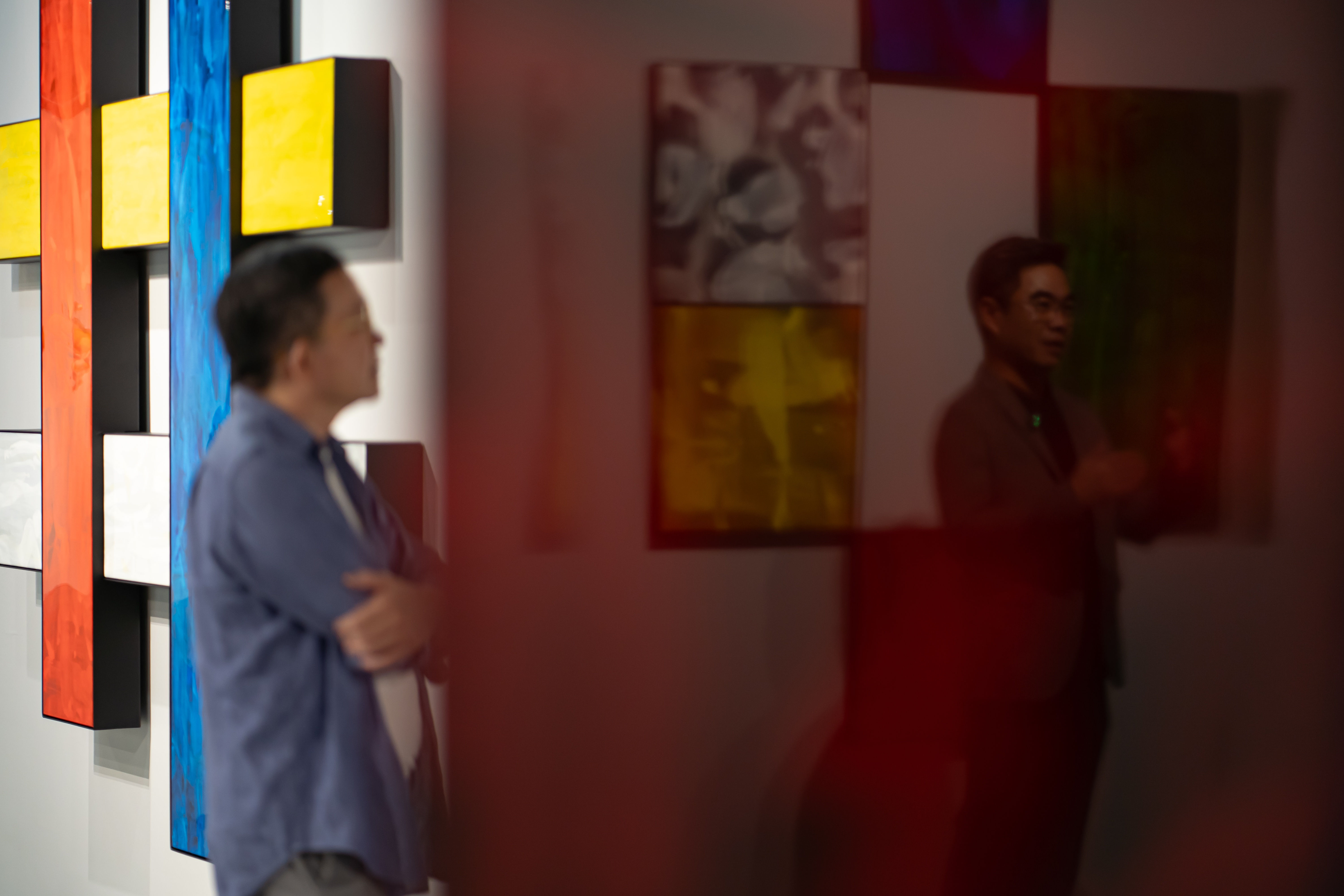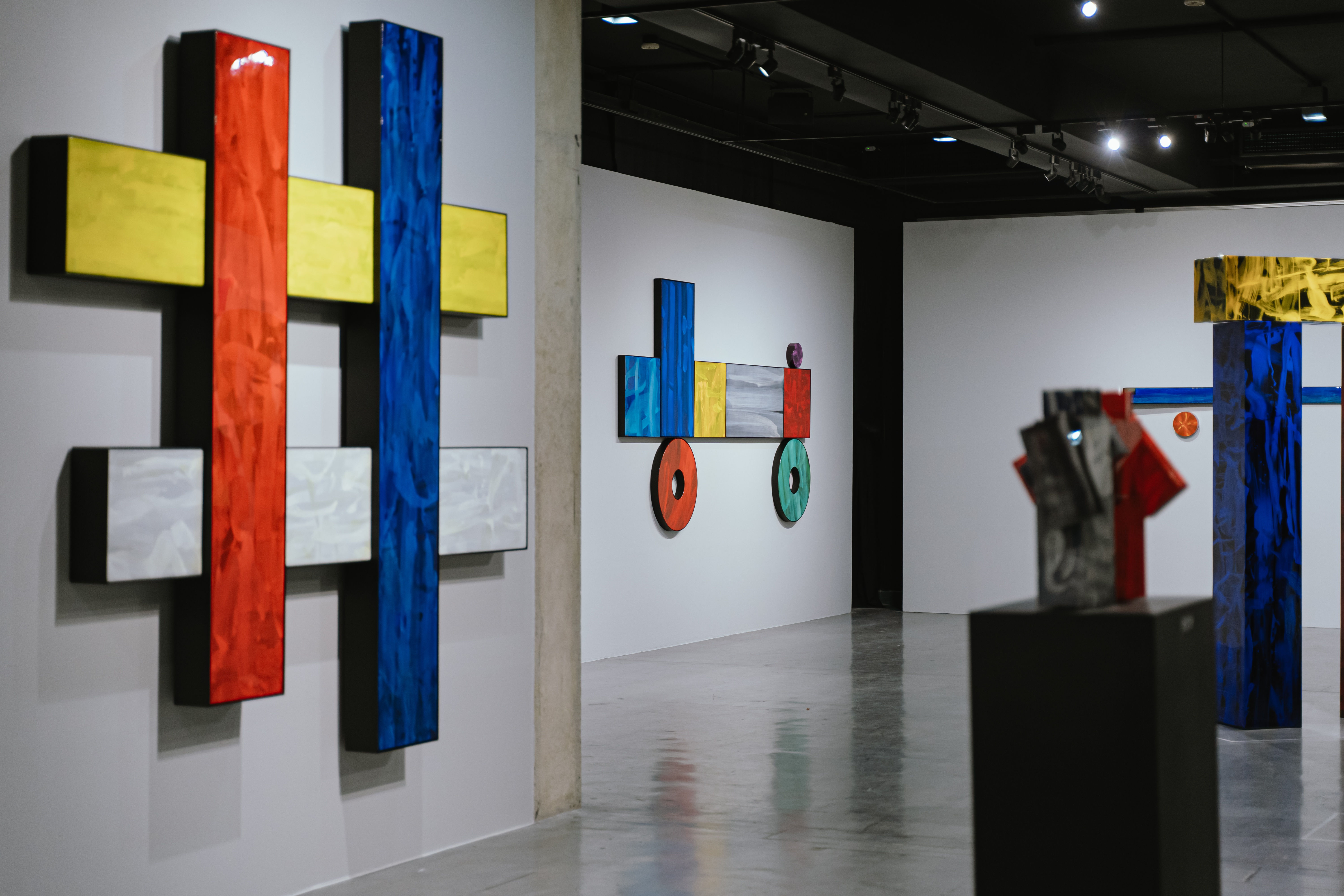 (Brackets) is a new exhibition by Kitikong inspired by his observations and playtime with his son. He believes that all learning, including his own, starts with play and experimentation, which is why he incorporates toys like blocks, Legos, and puzzle games, as well as primary colors, into this exhibition.