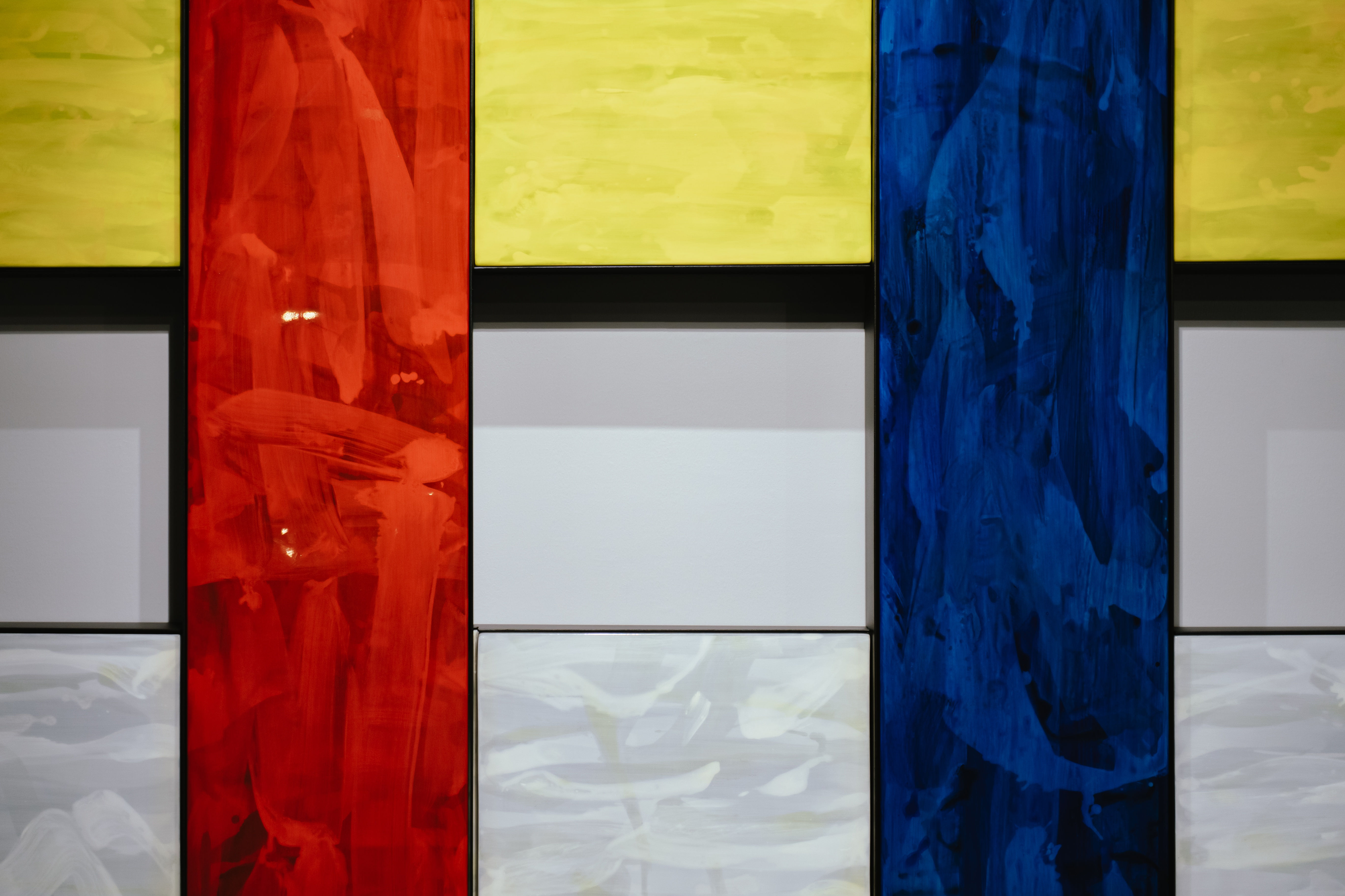 Red, yellow, and blue, the primary colors, are used and expressed through various shapes that can stand alone or be combined