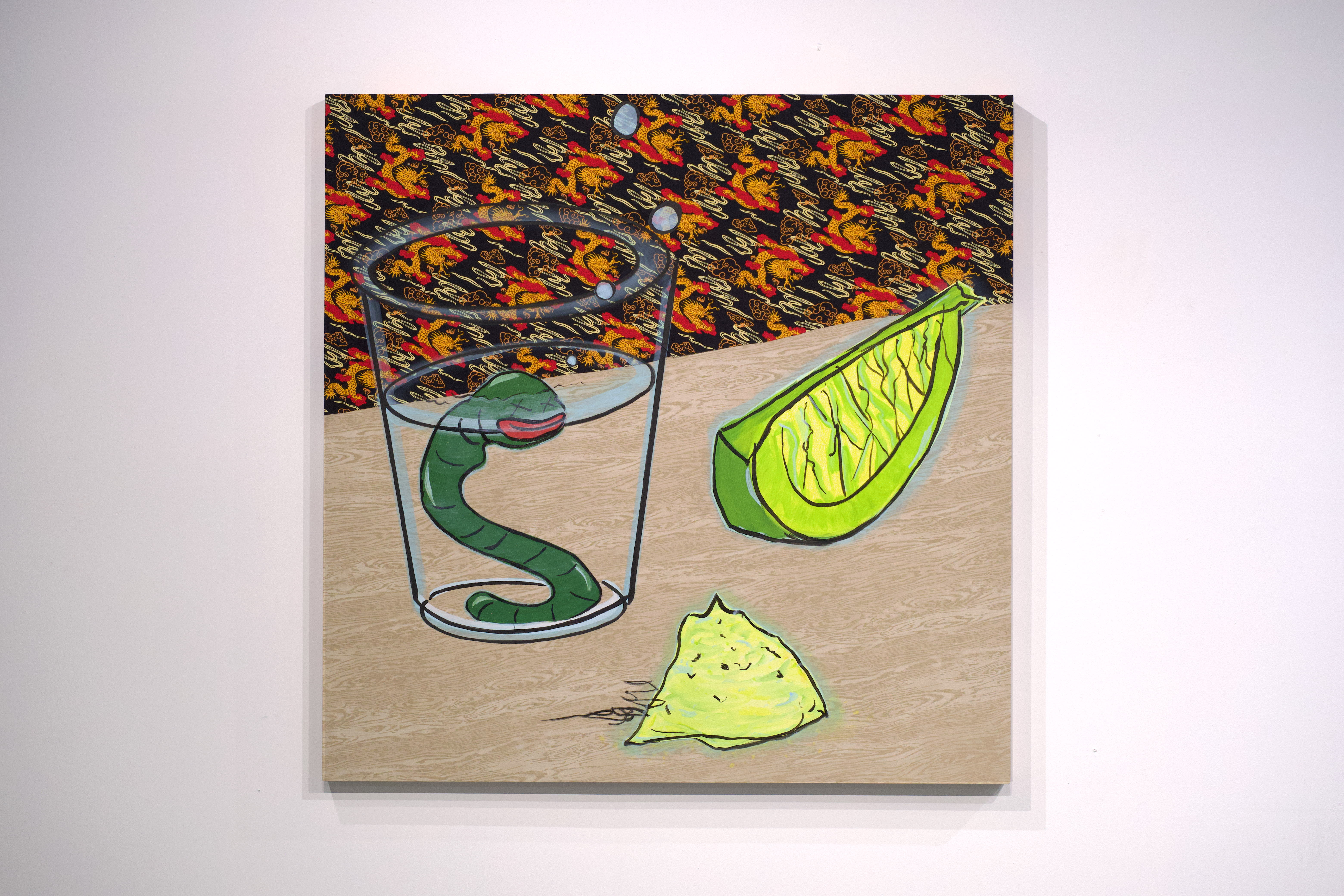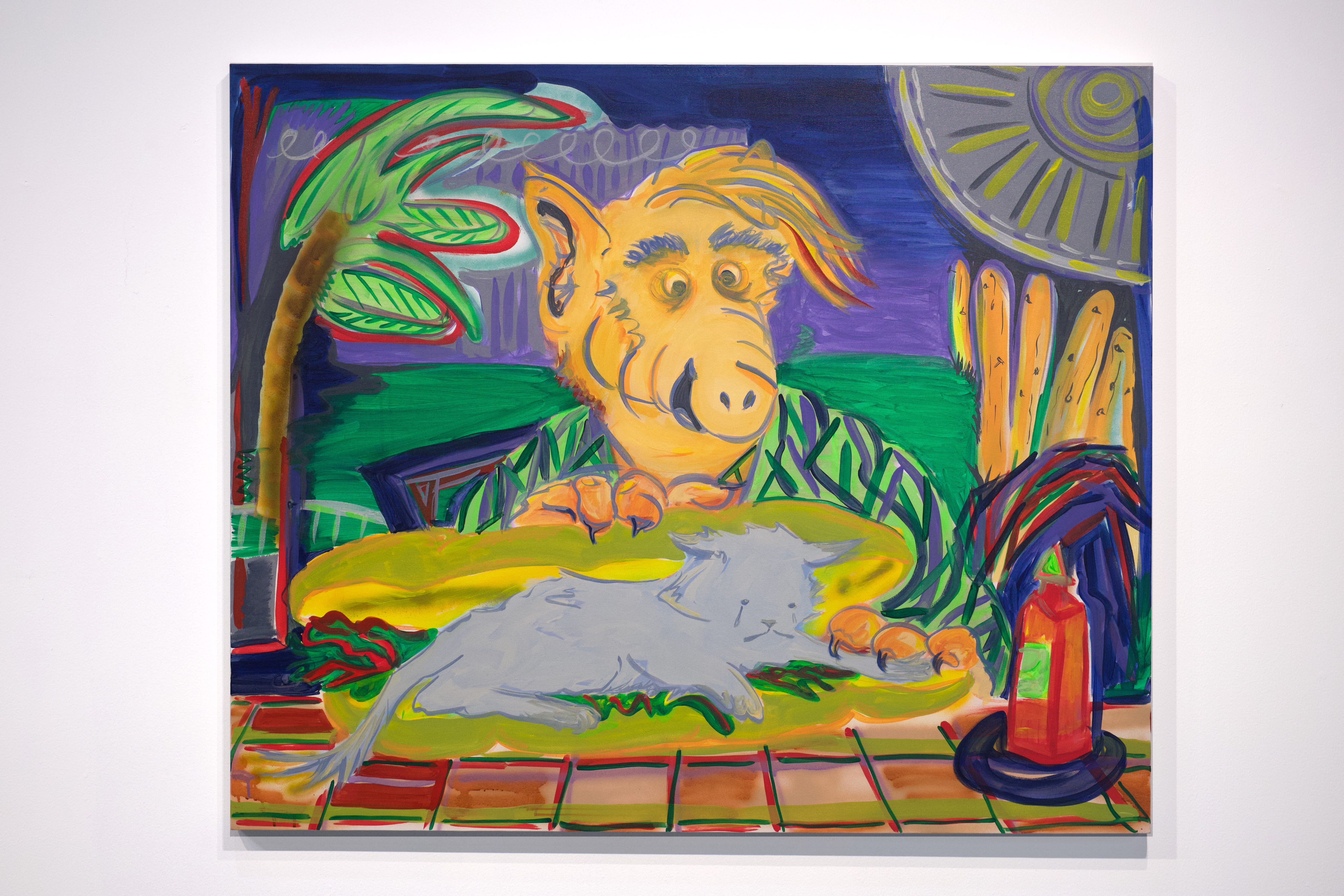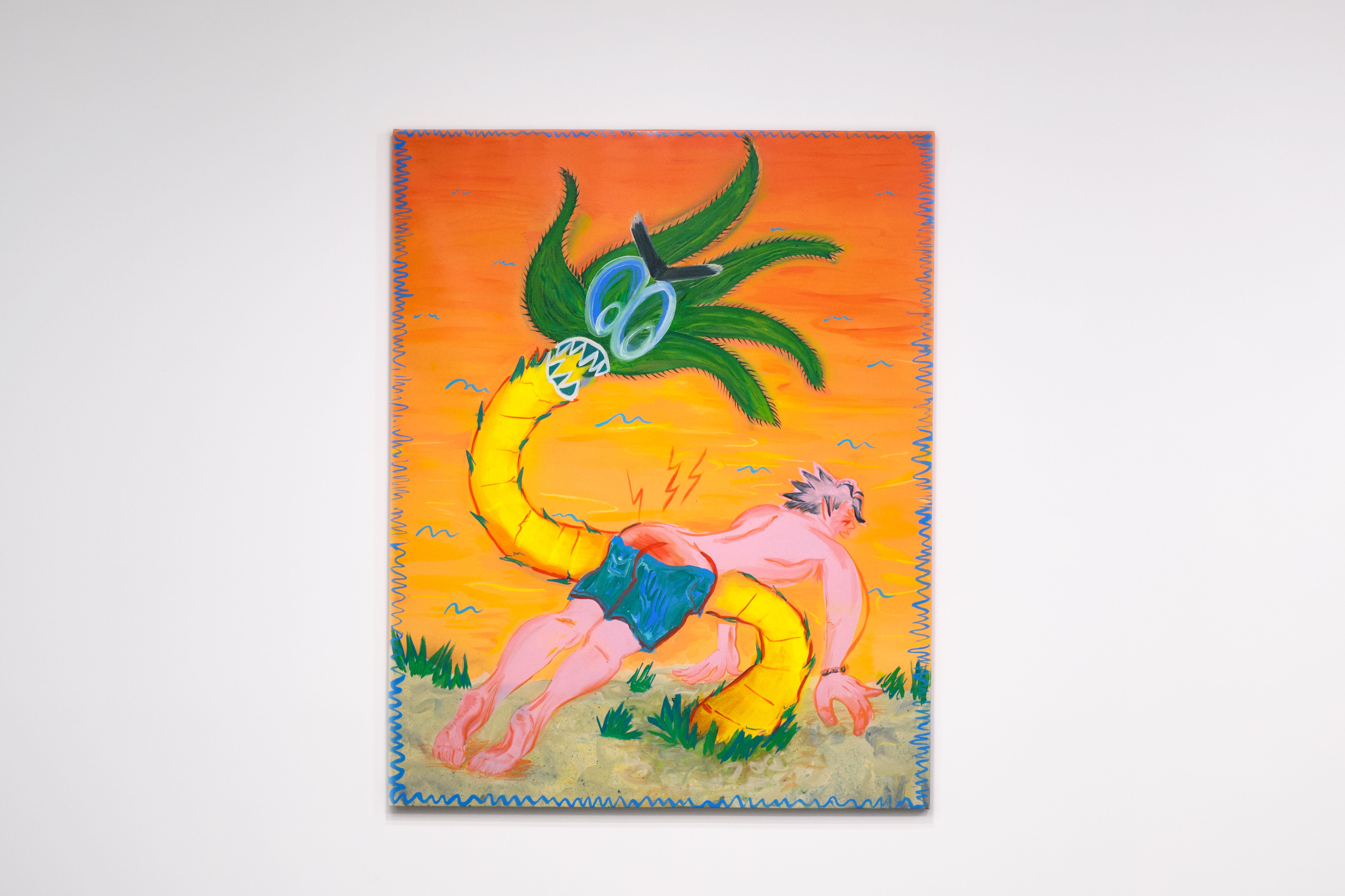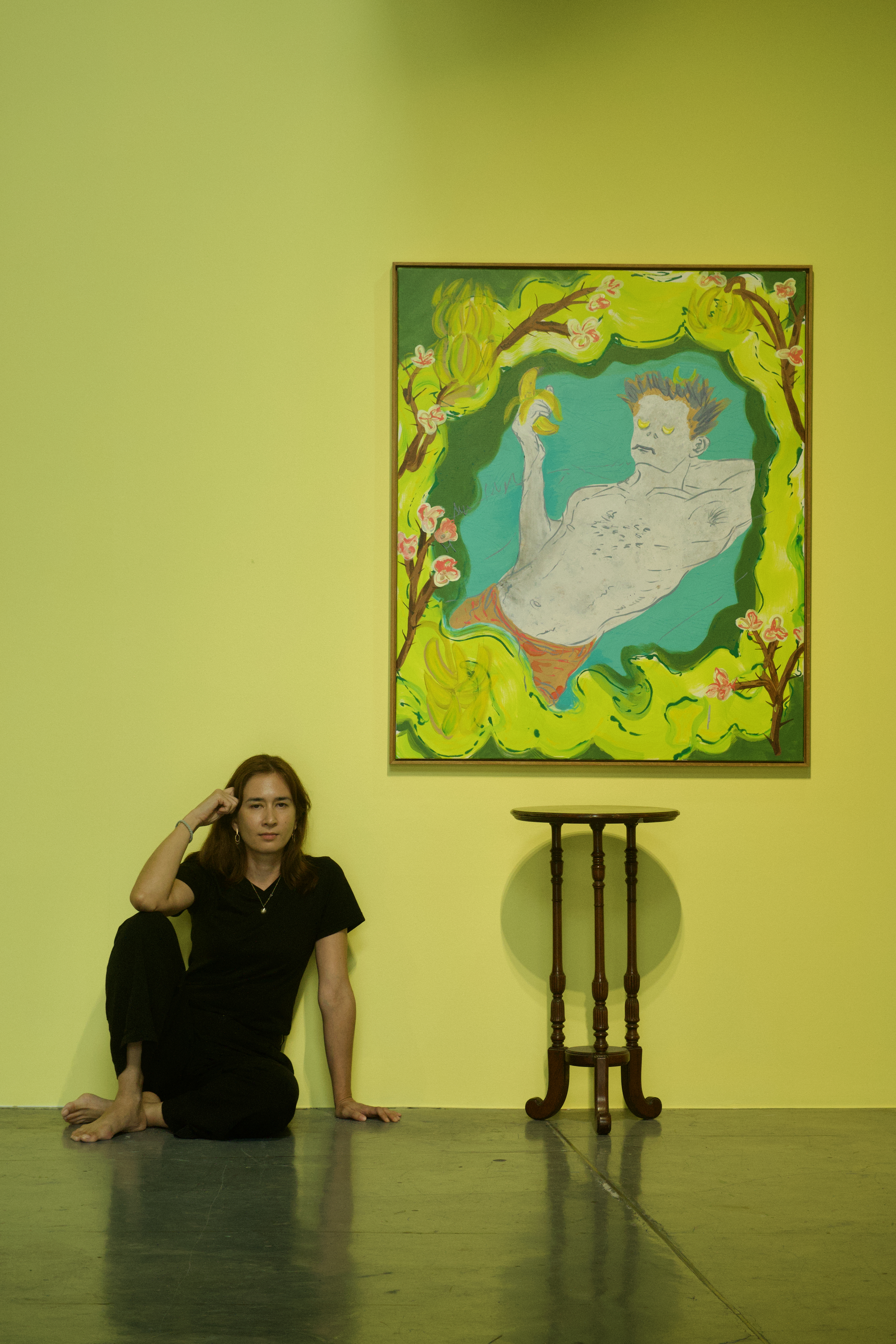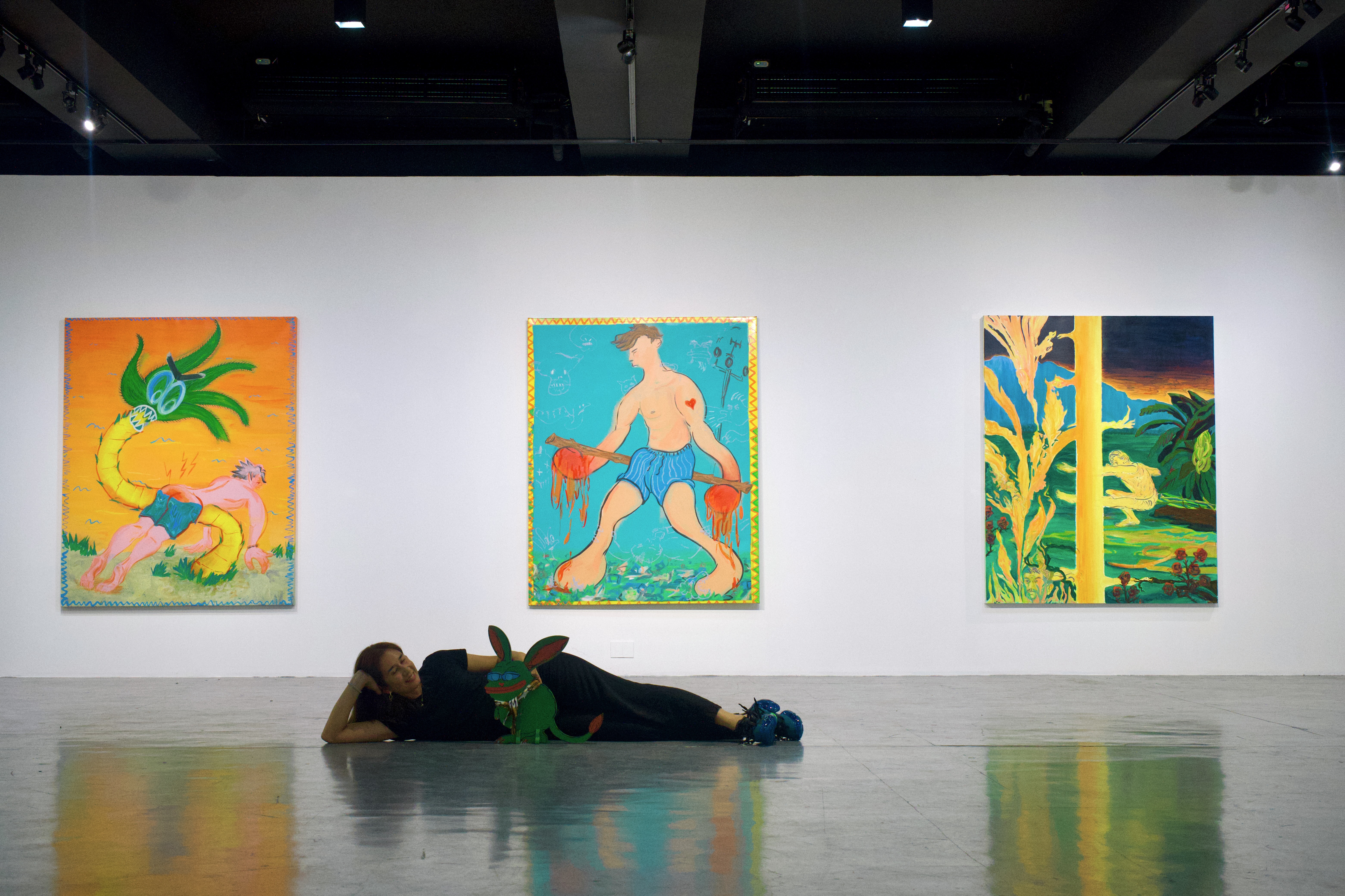 Drawing on her own multicultural upbringing, from the Golden Triangle in Thailand to the Philippines, Nepal, Indonesia, Malawi and Europe, Cooper weaves together memes, news headlines and TikTok fragments into layered paintings that reflect the intertwined gazes of both locals and outsiders. Her works reference everything from Passport Bros, They Are Eating Cats – Donald Trump, to Moo Deng, presenting Southeast Asia through what she calls a tropical fantasy lens.